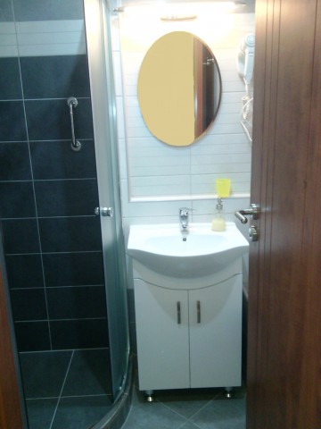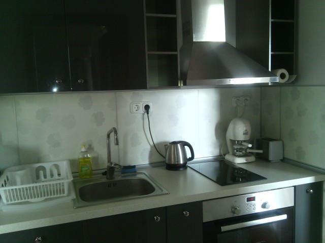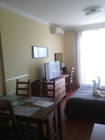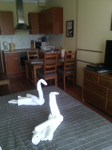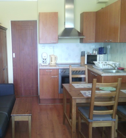 Felszereltség: dupla ágy, íróasztal, jól felszerelt konyha, étkezőasztal székekkel, szekrények, kanapéágy, az erkélyen asztal székekkel.